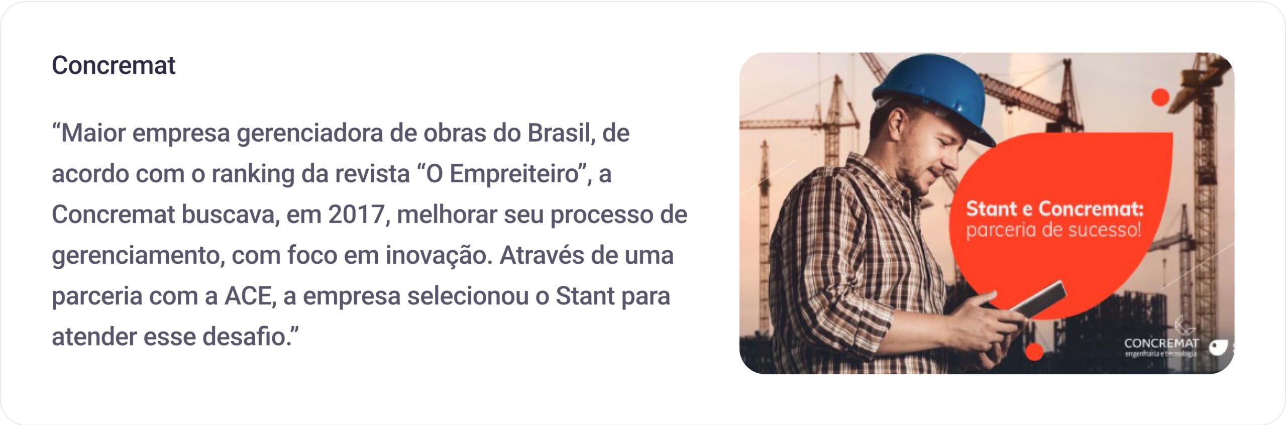 Maior empresa gerenciadora de obras do Brasil, de acordo com o ranking da revista “O Empreiteiro”, a Concremat buscava, em 2017, melhorar seu processo de gerenciamento, com foco em inovação. Através de uma parceria com a ACE, a empresa selecionou o Stant para atender esse desafio.