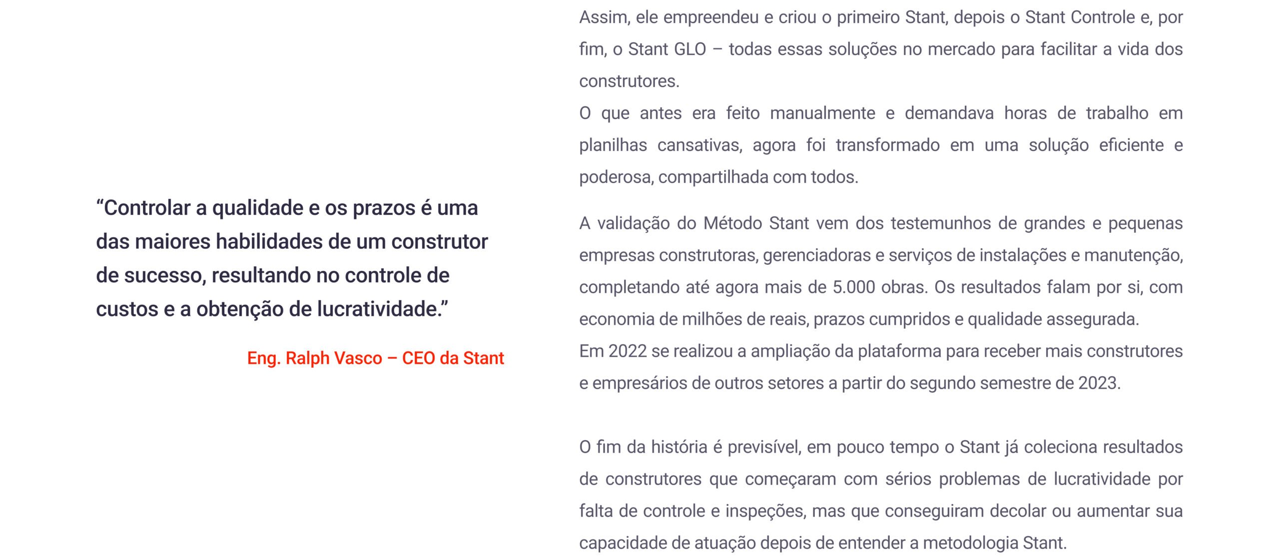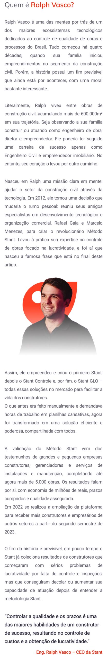 “O engenheiro Rodrigo Maia há 10 anos usando Stant, hoje controlando prazo, custo e qualidade em duas torres com 500 salas comerciais de luxo.”